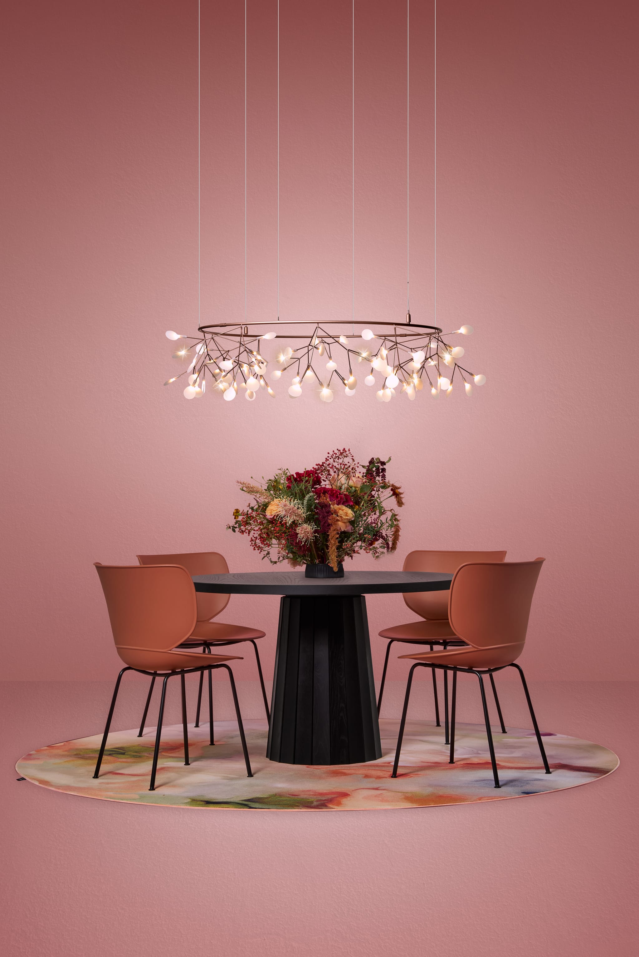 At its centre, the sculptural Container Table is adorned with delicate details, surrounded by the soft embrace of Hana Chairs. Overhead, the enchanting Heracleum III chandelier casts a gentle, floral-inspired glow, completing the scene with an air of sophisticated playfulness. Below, a vibrant garden-inspired carpet anchors the space, while blooming hues and intricate patterns infuse the room with a festive spirit.