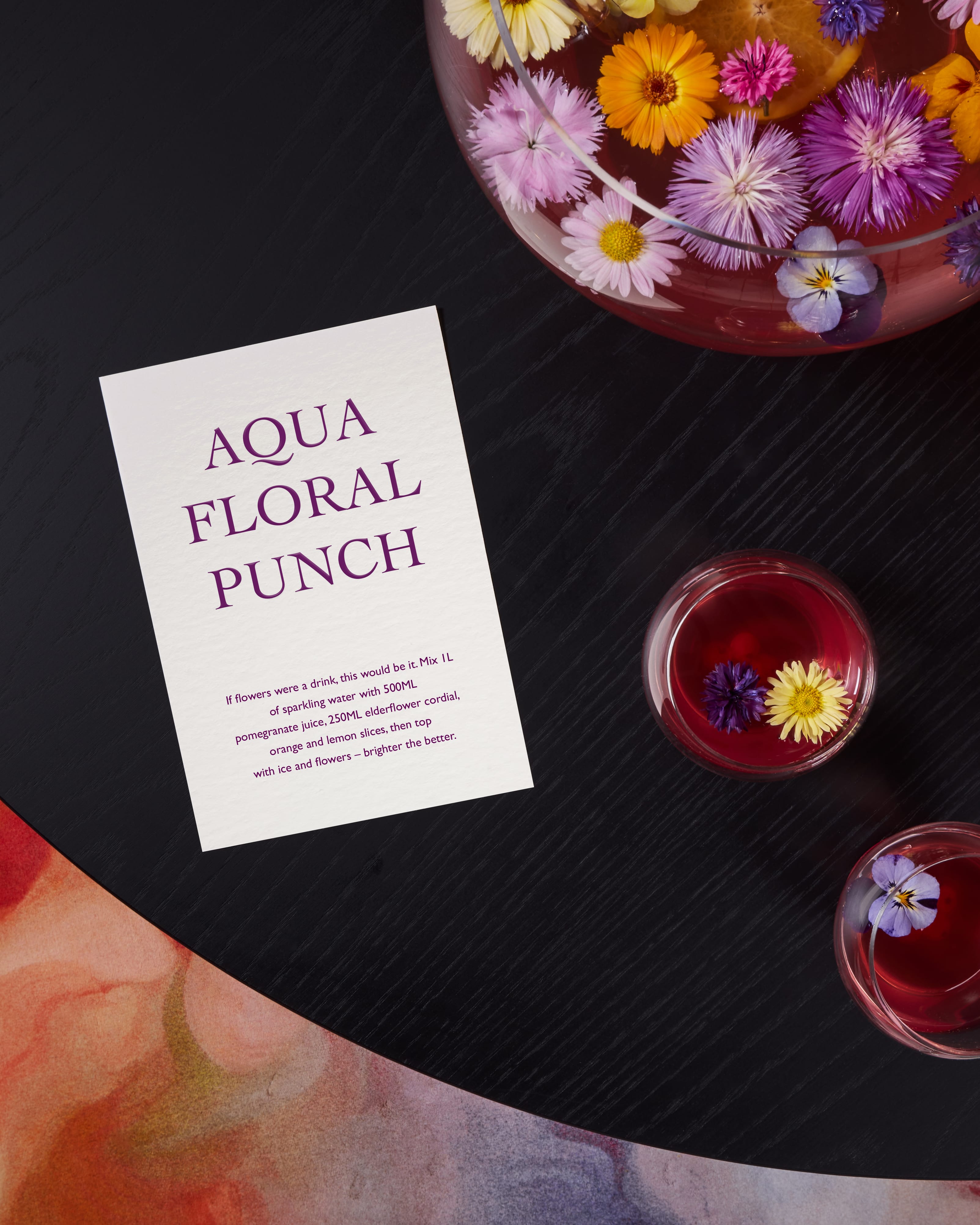 If flowers were a drink, this would be it. Mix 1L of sparkling water with 500ML pomegranate juice, 250ML elderflower cordial, orange and lemon slices, then top with ice and flowers – brighter the better.